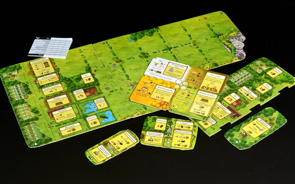 Основой служит обновлённая «Агрикола (новое издание)» на 1–4 игроков, где каждый ход вы размещаете рабочих на общем поле действий, конкурируете за ресурсы и планируете долгосрочное развитие. В начале партия ощущается тесной и скромной: маленький дом, мало ячеек под посевы и пастбища, всего пара членов семьи, которых приходится беречь и грамотно направлять. Постепенно вы расширяете жилище, обзаводитесь новыми рабочими, освобождаете место под поля и загоны, а к финалу стол превращается в насыщенную мозаичную ферму, отражающую принятые решения.