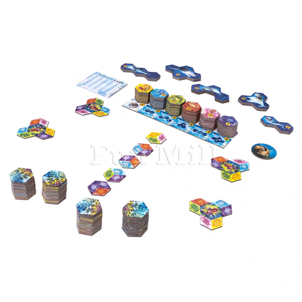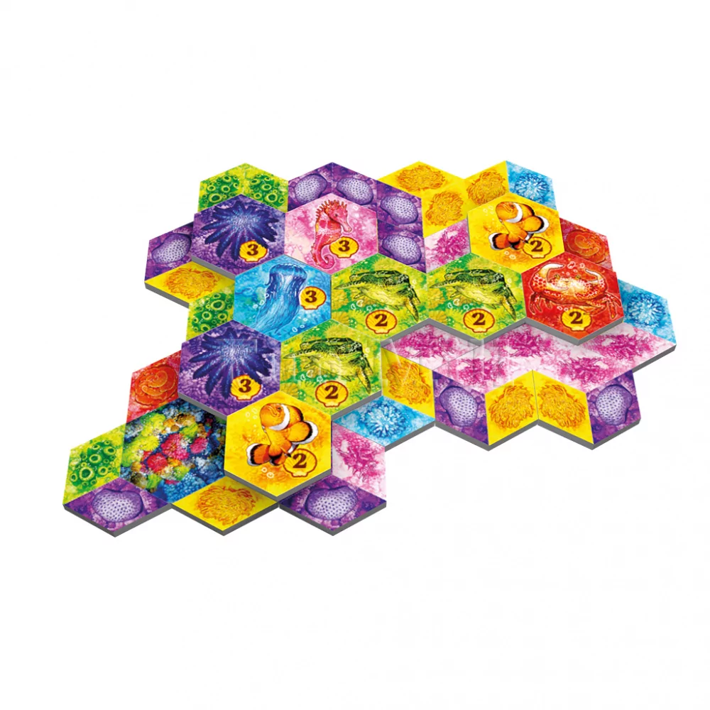 У каждого игрока есть личное поле, на которое по ходу партии выкладываются шестигранные тайлы с изображением различных видов кораллов. Каждый тайл состоит из нескольких сегментов, и от того, как вы соединяете их между собой, зависит формирование цветных колоний. В свой ход вы выбираете один из доступных тайлов из общего пула и аккуратно вписываете его в свою подводную локацию, стараясь одновременно расширить уже существующие группы кораллов и оставить пространство для будущих ходов.