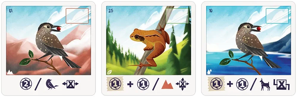 Цель у всех игроков одна — заполнить общий альбом фотографиями дикой природы, выкладывая карты в сетку 5×5. В центр стола формируется «страница альбома» — поле, куда вы будете добавлять новые снимки; каждая карта изображает часть пейзажа или сцену с животными, растениями и другими деталями Альп. В свой ход игрок обязан добавить как минимум одну карту к уже выложенным, соблюдая границы сетки: новая фотография должна примыкать к существующей по вертикали или горизонтали и не выходить за пределы будущего альбома.
