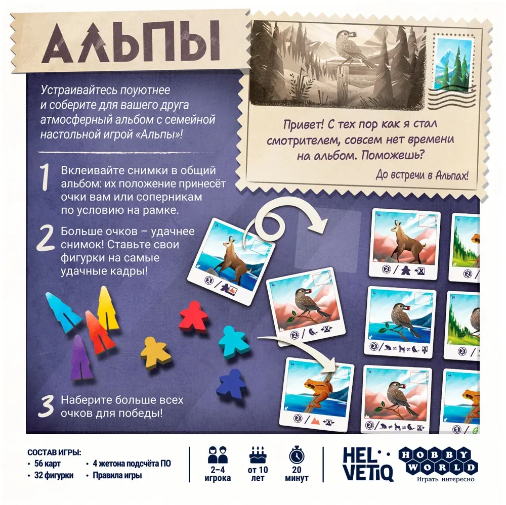 «Альпы» — уютная семейная настольная игра, в которой вы отправляетесь на фотоохоту по швейцарскому национальному парку и вместе создаёте общий альбом снимков дикой природы. По сюжету старый знакомый стал смотрителем в парке и совсем не успевает заниматься своим альбомом, поэтому зовёт вас на помощь: нужно сделать самые удачные кадры и так расположить их на страницах, чтобы общая композиция выглядела гармоничной и атмосферной. Играть можно в одиночку или в компании до четырёх человек, а партии получаются короткими и медитативными, с приятным визуальным результатом на столе.