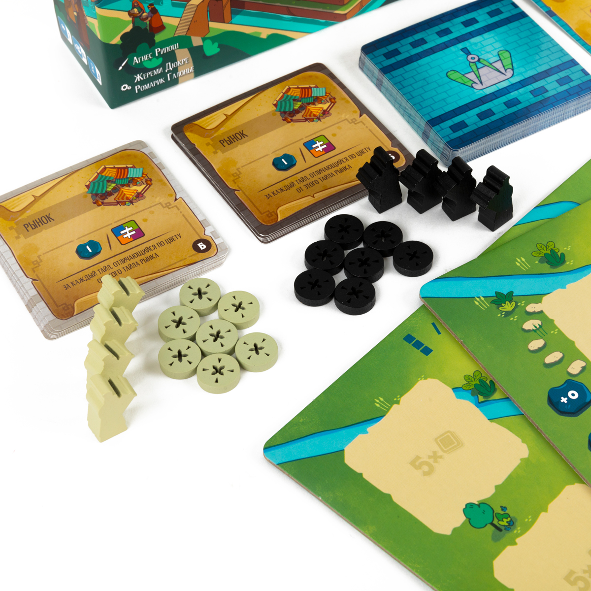 У каждого игрока есть собственный планшет города – сетка, на которую вы будете выкладывать тайлы построек, формируя кварталы и создавая удачные комбинации. В центре стола размещается общий планшет построек с несколькими стопками тайлов; рядом лежат планшет благосклонности царя и трек подсчёта очков. Каждый участник получает набор фигурок архитекторов и фишек своего цвета, а также стартовые карты проектов – цели, определяющие, как именно нужно расположить здания, чтобы получить дополнительные победные очки в конце партии.