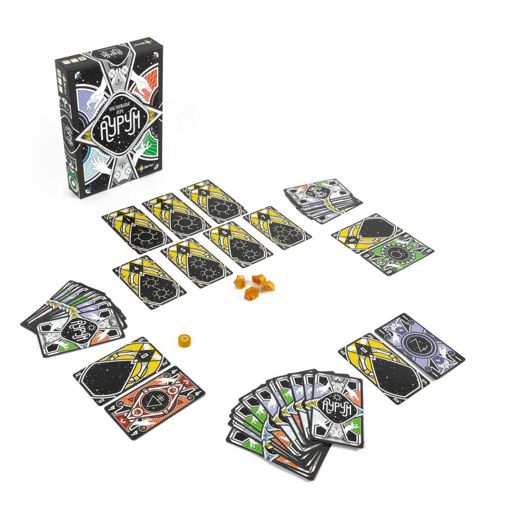 «Аурум» – конкурентная карточная игра на взятки с необычным правилом: здесь запрещено ходить картой уже выложенного металла, а золото побеждает всё. Игроки выступают в роли алхимиков, которые после долгих опытов научились превращать обычные металлы в золото и теперь соревнуются, кто лучше владеет формулой. Очки здесь приносят не только выигранные взятки, но и точные прогнозы – вам нужно заранее заявить, сколько взяток вы возьмёте в раунде, и постараться выполнить эту ставку.