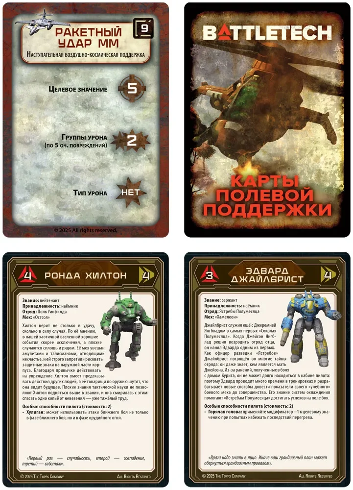 Набор также включает 16‑страничную брошюру с карточками мехов, 8 двусторонних карточек пилотов и 12 двусторонних карточек «Альфа‑удара». Эти компоненты упрощают использование дополнения как в классическом BattleTech, так и в упрощённом режиме Alpha Strike: характеристики всегда под рукой, а пилоты добавляют отряду индивидуальность. Помимо игровых материалов, вы найдёте 16‑страничный обзор вселенной с историей наёмников и 32‑страничный рассказ, помогающие глубже погрузиться в антураж мира.