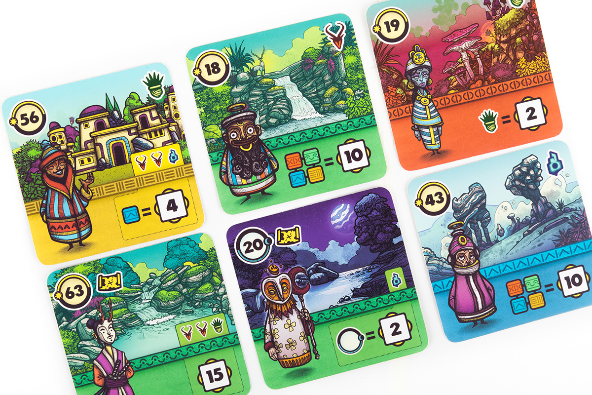Все игроки одновременно выбирают одну карту из руки и кладут её перед собой лицевой стороной вниз. Затем они одновременно раскрывают выбранные ими карты и добавляют их в свои игровые области, справа от карты, сыгранной ими в предыдущем раунде. На картах региона вам встретятся местные жители, которые дадут вам задания на поиск определённых ресурсов, выполнение которых принесёт вам очки славы в конце игры.