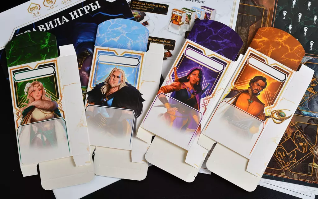 Содержимое набора даёт всё необходимое, чтобы «обнулить» проход кампании без покупки второй базы. Внутри вы найдёте 4 коробочки полубогов — индивидуальные комплекты для игроков, и 26 листов с наклейками, которые заменят уже использованные стикеры в базовой коробке. Также в набор входят правила базовой игры и листовка с инструкциями по перезагрузке, которые пошагово объясняют, как подготовить ваш экземпляр «Демиурга» к новой кампании.