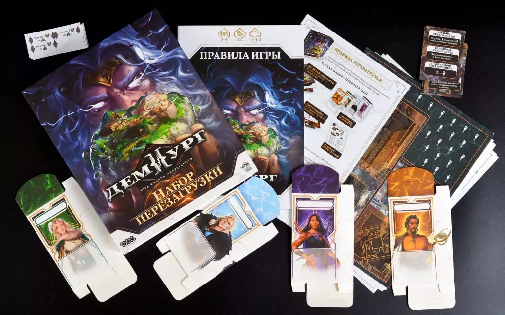 В «Демиурге» игроки выступают в роли полубогов, наблюдающих и вмешивающихся в схватку двух великих пантеонов — древнегреческого и скандинавского. По мере прохождения кампании базовая игра меняется: вы наклеиваете стикеры, открываете новые элементы, принимаете судьбоносные решения, и ваш экземпляр «Демиурга» превращается в уникальную историю. После финального сценария многие компоненты уже не вернуться к изначальному состоянию — именно поэтому и существует «Набор перезагрузки».