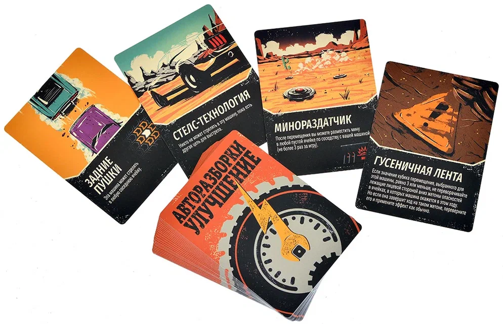 Дополнение также вводит тюнинг машин через колоду улучшений. В наборе 27 карт улучшений, и именно они позволяют превратить стандартные автомобили в уникально настроенные боевые машины. Улучшения могут усиливать защиту, повышать скорость, добавлять особые действия, модифицировать броски кубиков или давать бонусы в определённых ситуациях. Игроки получают возможность не только приспосабливаться к трассе, но и заранее формировать стратегию, опираясь на выбранные апгрейды. Это создаёт ощущение настоящих «авторазборок», где каждая гайка и деталь имеет значение.