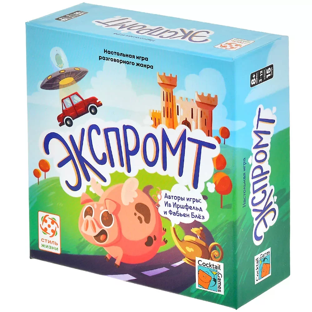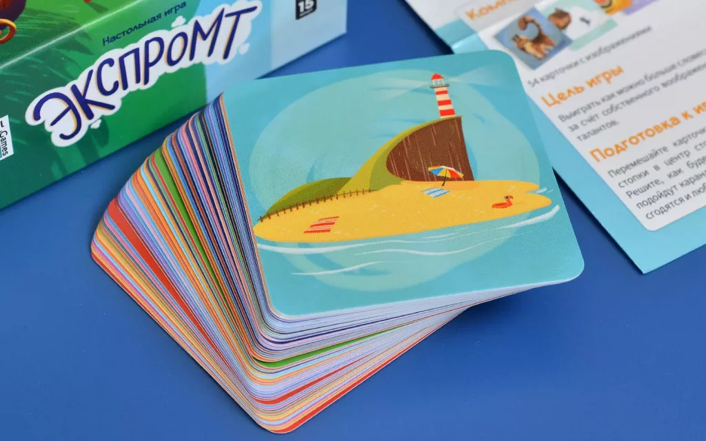 Компактная квадратная коробка и всего одна колода карт делают игру мобильной – её удобно брать с собой в поездку, на дачу или в гости. А универсальный формат без сложных компонентов позволяет разложить «Экспромт» практически где угодно: нужна только поверхность для карт и немного воображения.