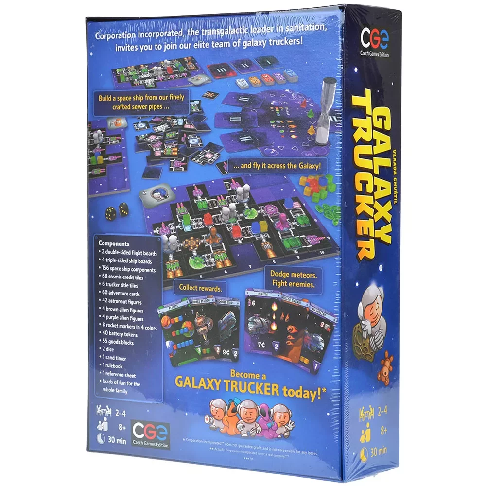 Эта версия Galaxy Trucker полностью на английском языке, включая правила, карты и обозначения. Игра рассчитана на 2–4 игроков и подходит для детей от 8 лет, если взрослые помогают с первыми партиями. Средняя длительность партии составляет около 60 минут, при желании можно играть отдельные рейсы или полноценную кампанию из нескольких полётов.