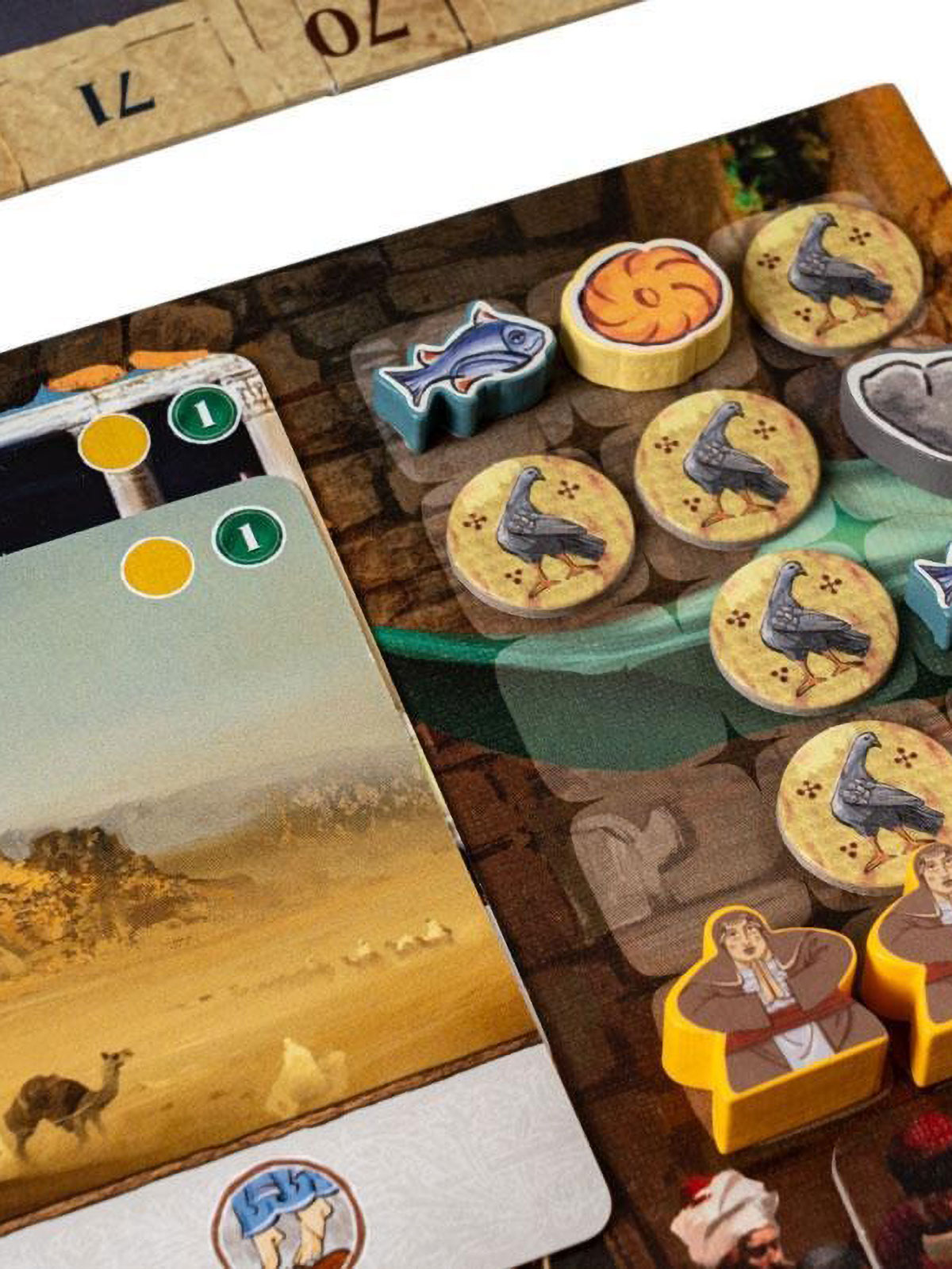 Геймплей строится вокруг розыгрыша карт и взаимодействия с локациями Иерусалима. Игрок выкладывает карту на свой планшет и получает цепочку действий: сначала срабатывает действие локации, затем действие последователя. В пустыне добывается камень, в озере — рыба, в горах — хлеб; храм позволяет отправлять последователей в нужные зоны, чтобы усилить будущие сборы, а рынок даёт возможность продавать, покупать и получать особенно эффективные карты. Так вы выстраиваете экономику, без которой не получится претендовать на лучшие места за столом.