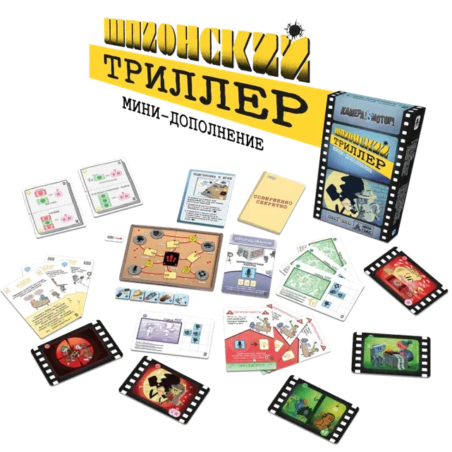 «Камера! Мотор! Шпионский триллер» – мини‑дополнение к кооперативной игре «Камера! Мотор!», посвящённое съёмкам напряжённого шпионского боевика. Ваша киностудия всё так же балансирует на грани банкротства, но теперь ставка сделана на фильм о двойных агентах, секретных операциях и утечках информации, где доверять нельзя никому. Дополнение добавляет новые компоненты и небольшое изменение правил, усиливая атмосферу паранойи и конспирации на съёмочной площадке.