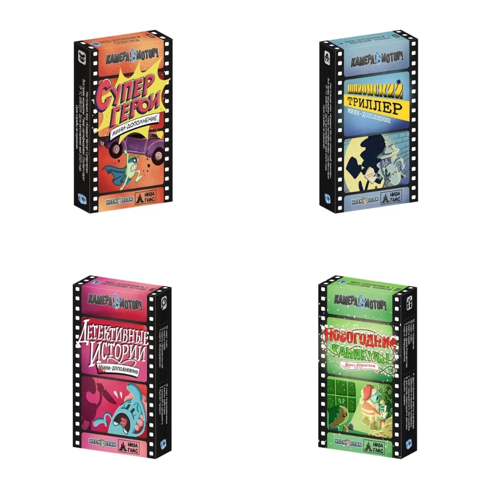 Набор из 4 мини‑дополнений к игре «Камера! Мотор!» объединяет все сюжетные пакеты серии и превращает вашу киностудию в универсальную фабрику жанрового кино. В одном комплекте вы получаете «Супергероев», «Детективные истории», «Новогодние каникулы» и «Шпионский триллер», а значит, можете снимать блокбастеры про героев в плащах, запутанные криминальные загадки, душевные рождественские истории и напряжённые шпионские боевики. Набор рассчитан на тех, кому понравилась базовая кооперативная игра и кто хочет максимум тематического разнообразия без покупки каждой коробочки по отдельности.