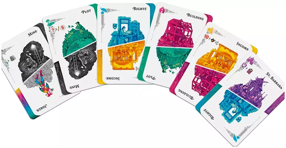 Игровой раунд строится на розыгрыше двусторонних карт действий. У каждого игрока есть набор таких карт; в свой ход вы выбираете карту и одну из её сторон, чтобы выполнить, например, добычу руды, покупку участка, получение разрешения на строительство, возведение здания гильдии, расширение шахты или участие в строительстве собора. Комбинации сторон и очередность розыгрыша позволяют выстраивать длинные стратегические цепочки: сначала обеспечиться ресурсами, затем занять выгодный участок и только потом ставить здесь доходное здание.