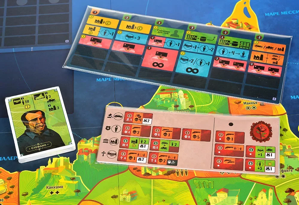 Партия длится всего четыре раунда, но каждый из них делится на две насыщенные фазы. В фазе планирования вы используете продвинутое выставление рабочих: перемещаете фишки влияния по специальным планшетам действий, чтобы нанимать солдат, строить здания, покупать технику, зарабатывать деньги, улучшать способности семьи и выдавать секретные приказы на карту. Ключевой twist — экономика влияния: свои ячейки вы используете бесплатно, а за доступ к действиям союзника или соперников нужно платить, превращая сам выбор действий в напряжённую мини‑игру.