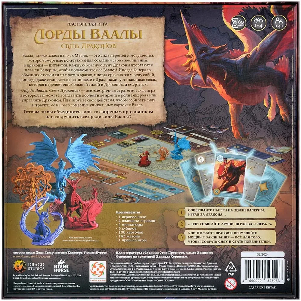 Игра рассчитана на 1–4 участников и предлагает два типа сторон: генералов и драконов. Генерал командует армией, развивает инфраструктуру, защищает земли и собирает Ваалу с территорий, используя её для усиления войск и проведения мощных действий. Дракон, напротив, — одиночная разрушительная сила: он летит по карте, сжигает поля боя, уничтожает армии и высасывает Ваалу прямо из разорённых регионов. Такая асимметрия делает партии разнообразными: вам придётся по‑разному мыслить и планировать, играя то за строителя‑командира, то за хищника‑дракона.