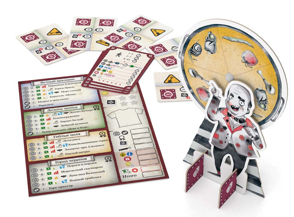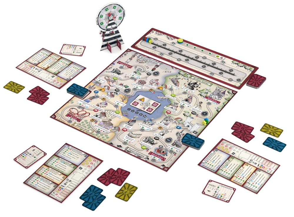 Ход тактический: выбирайте аттракционы, учитывайте время и очередь. Колесо паэлья крутится на заклёпке, фишки рвоты — за переедание, жетоны техобслуживания блокируют зоны. Подсчёт в блокноте: очки за миссии, фото, покупки. Победитель — с максимумом впечатлений.