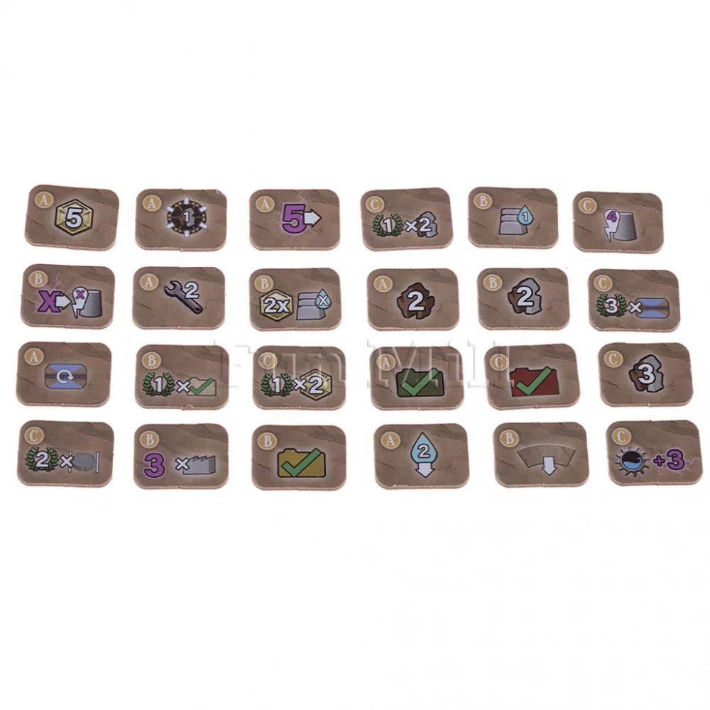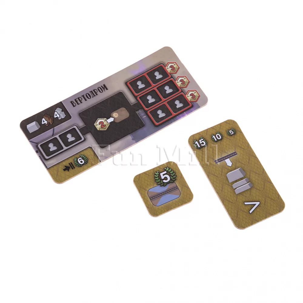 Жетоны рабочих посёлков — стартовые точки, которые мостами соединяют с областями действий, формируя сеть логистики.