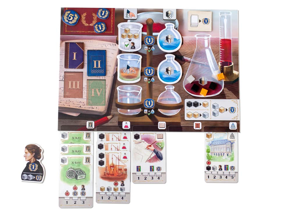 Вы будете собирать ресурсы, покупать карты действий, повышать лимиты лаборатории и двигаться по треку научных достижений.