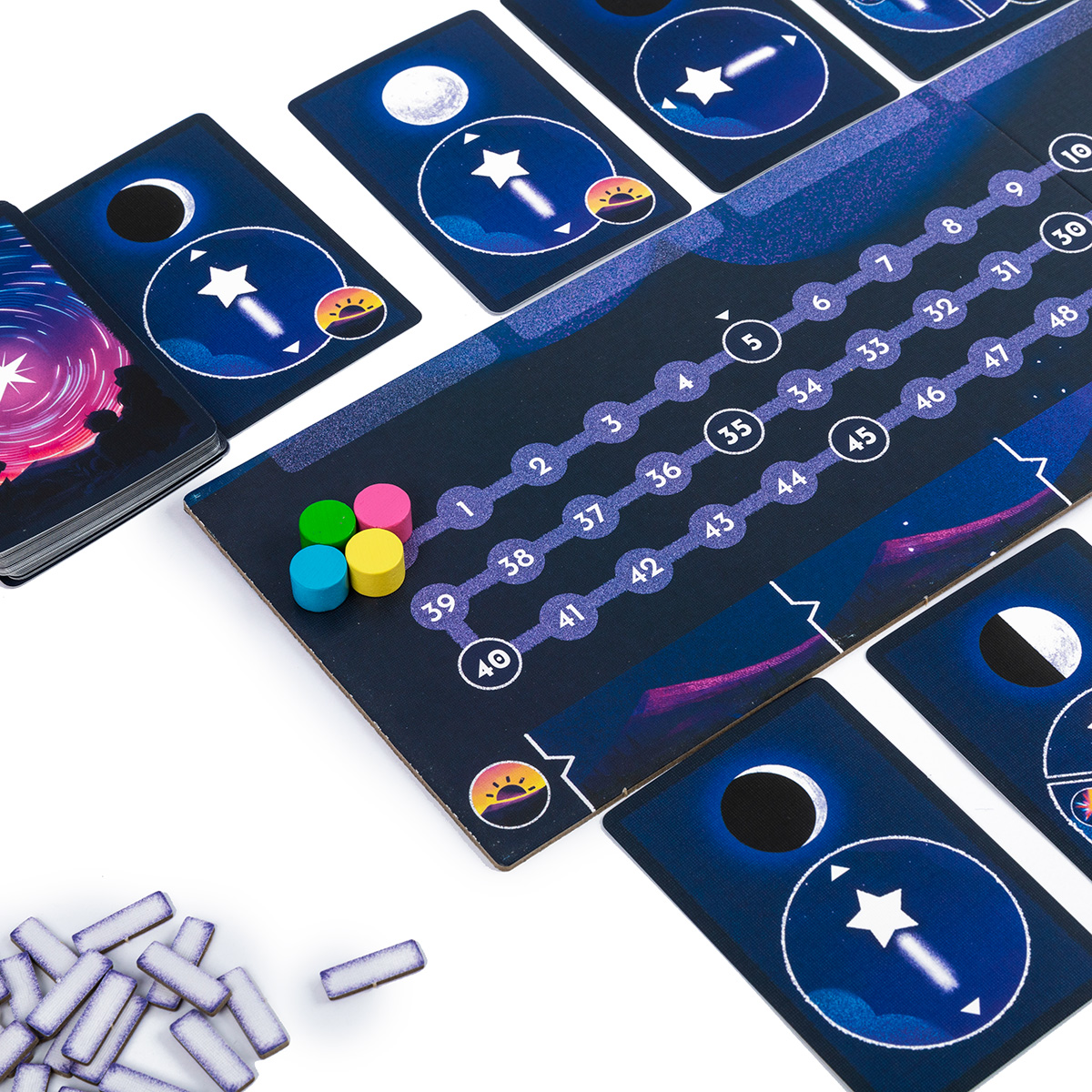 Перед началом партии вы собираете модульное поле из шести частей, образующих звёздное небо, и обрамляете его рамкой из пяти фрагментов с фазами Луны. Затем каждый игрок выбирает цвет и получает 35 звёзд этого цвета, а также памятку, фишку подсчёта очков и набор личных целей. Рядом с каждой фазой Луны выкладывается по одной карте общей цели, так что в каждом секторе рамки закреплено своё задание.