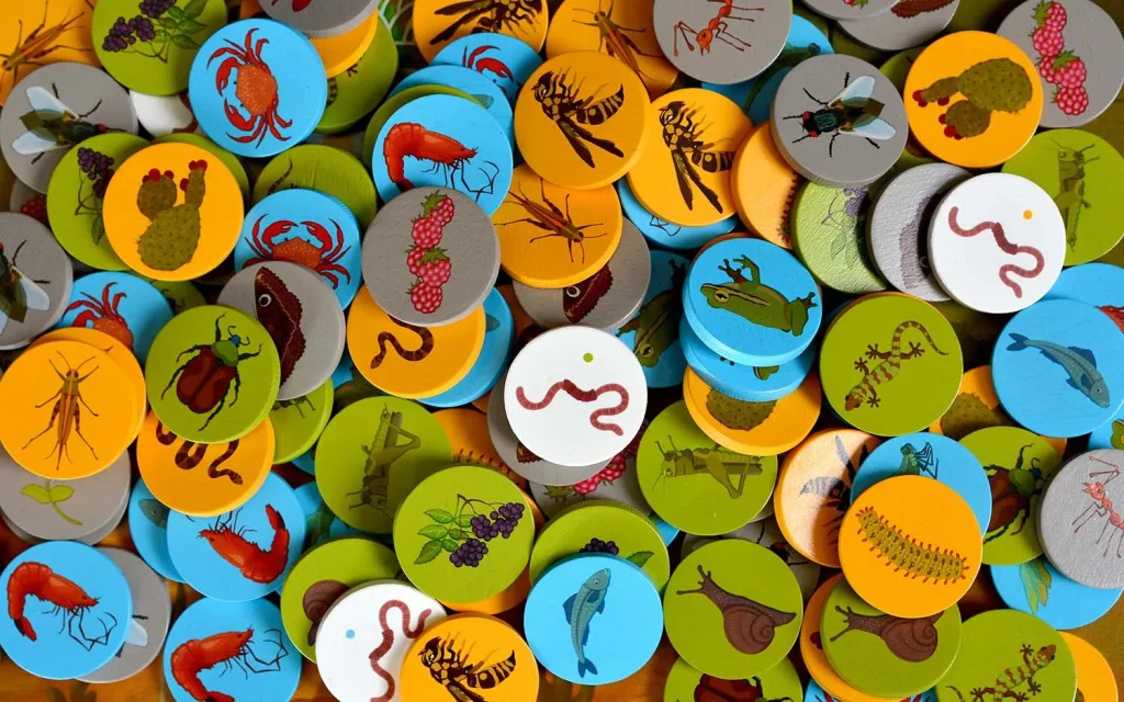 Корм представлен жетонами разных типов – насекомые, семена, рыба и другие виды провизии, характерные для конкретных биомов. Собирая эти жетоны, вы не просто пополняете запас пищи, но и формируете наборы, необходимые для кормления птенцов и выполнения целей. На личном планшете каждый игрок размещает сегменты биомов и собранные жетоны так, чтобы закрывать условия карт целей и получать за это победные очки.