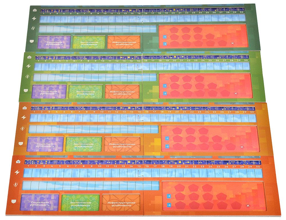 Ресурсы в игре представлены жетонами: углеродные блоки (которые нужно убирать), энергия, деньги и специальные фишки проектов. Игроки собирают их через базовые действия (производство, торговля, исследования) и тратят на амбициозные инициативы. Два кубика используются для случайных событий или генерации ресурсов, добавляя лёгкую вариативность без чрезмерной случайности.