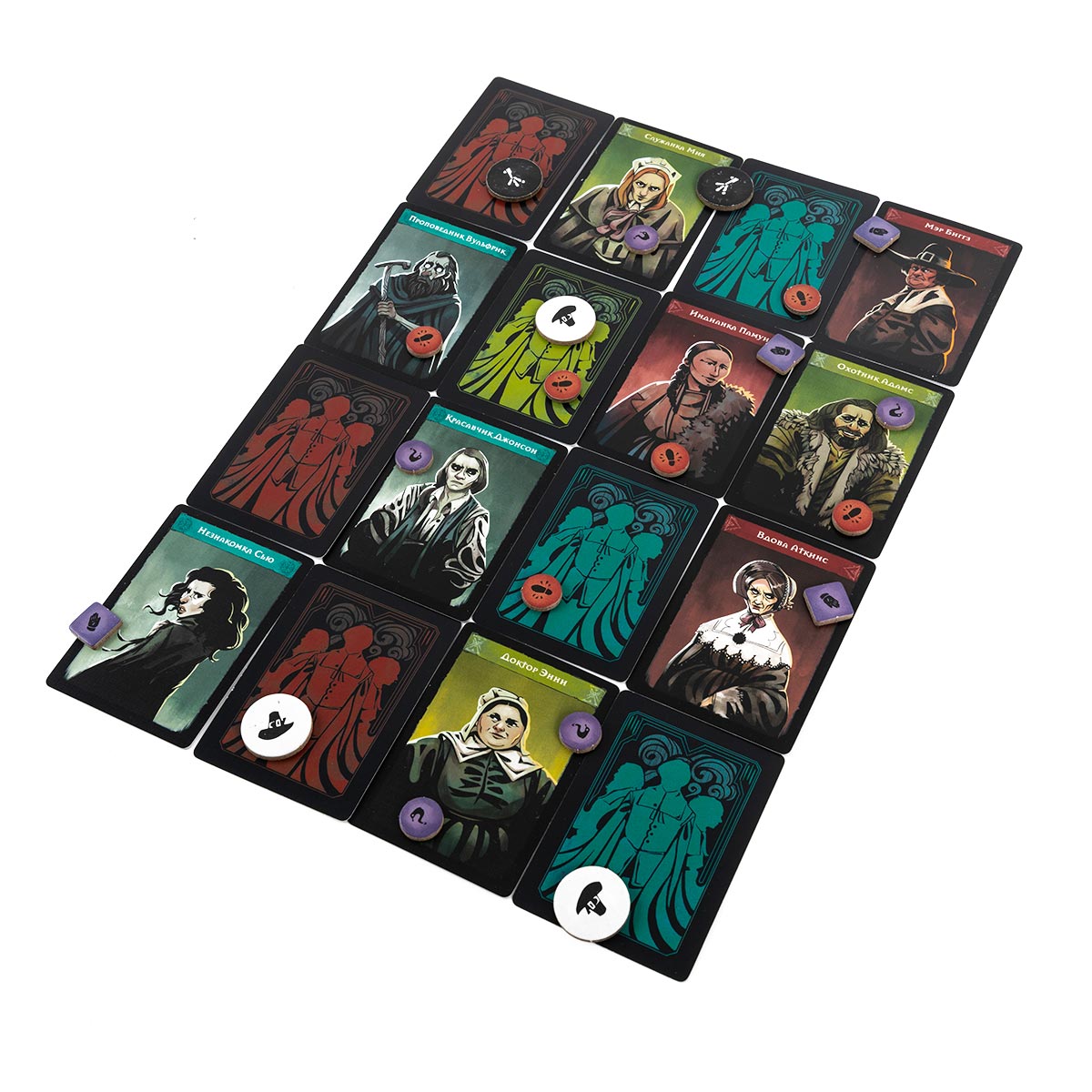 • 9 карт жителей и 9 соответствующих карт подозреваемых (одна из них тайно определяет личину ведьмы)