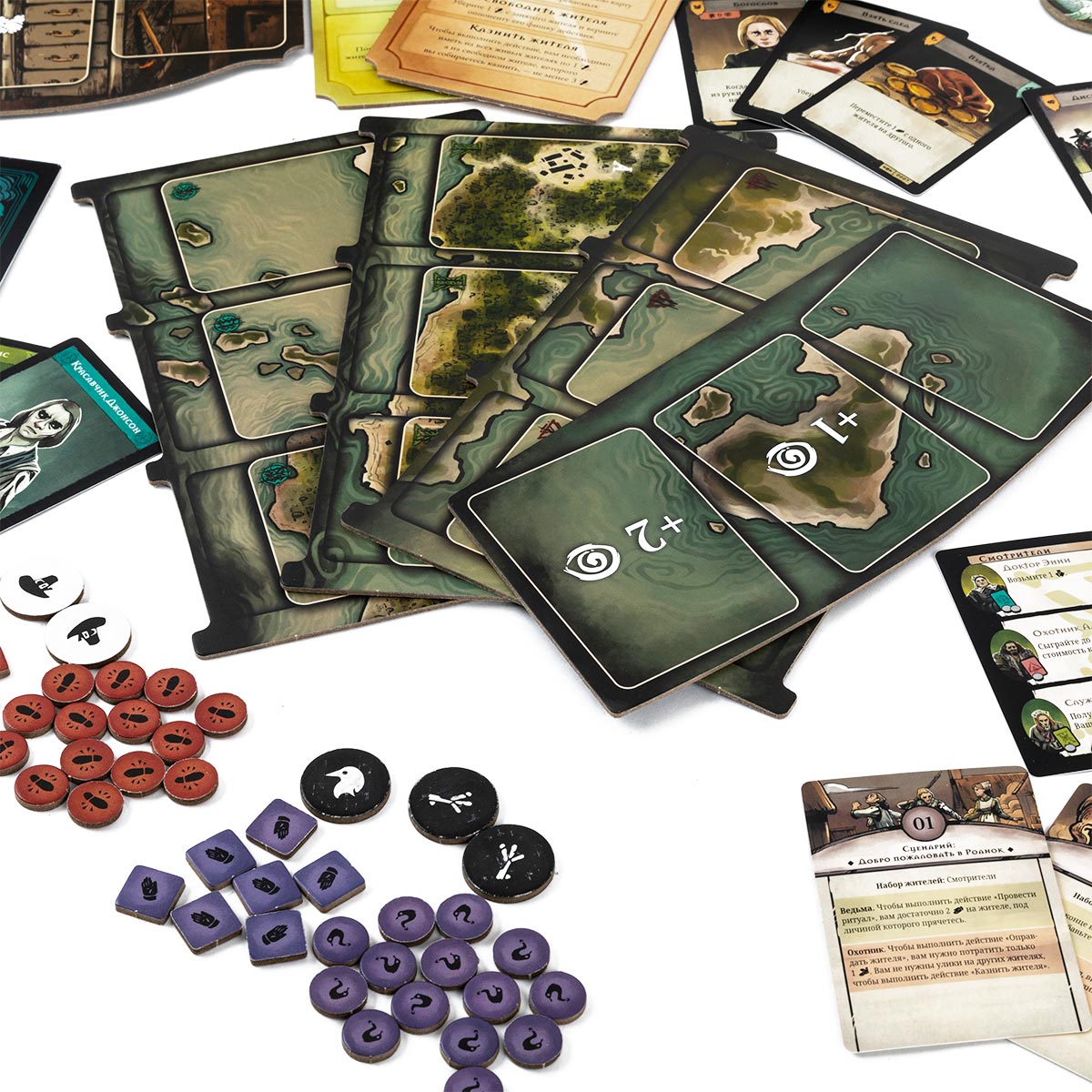 Особое значение имеют колоды игроков. Перед партией каждая сторона может настраивать свою колоду, выбирая комбинации карт по собственному вкусу и стилю игры. Ведьма делает ставку на отвары, чары, управление секретами и хитрую манипуляцию жителями, а охотник — на союзников, допросы, сбор улик и контроль ключевых локаций поселения. Такой deck construction делает каждую партию уникальной и позволяет оттачивать свою стратегию от игры к игре.