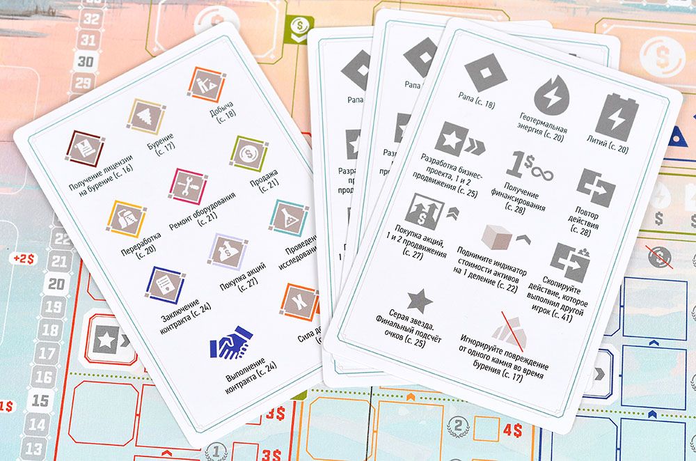 Каждый игрок управляет собственной компанией с индивидуальным планшетом. На планшете отмечены основные действия и инфраструктура: лицензии на участки, скважины, линии переработки, склады и техника. В свой ход игрок ставит рабочего на выбранное действие (или использует соответствующую карту), чтобы:​