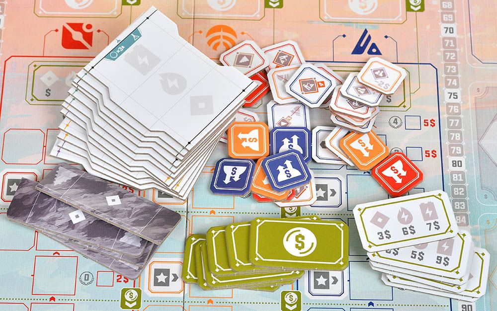 На общем поле располагаются: рынок участков, треки стоимости трёх компаний, слоты для общих целей и несколько рядов карт. В открытой выкладке доступны усовершенствования, контракты и карты денег с печатными действиями на обратной стороне. В конце раунда ряды частично обновляются, поэтому окно возможностей постоянно смещается, а доступ к нужным картам становится предметом борьбы между игроками.​