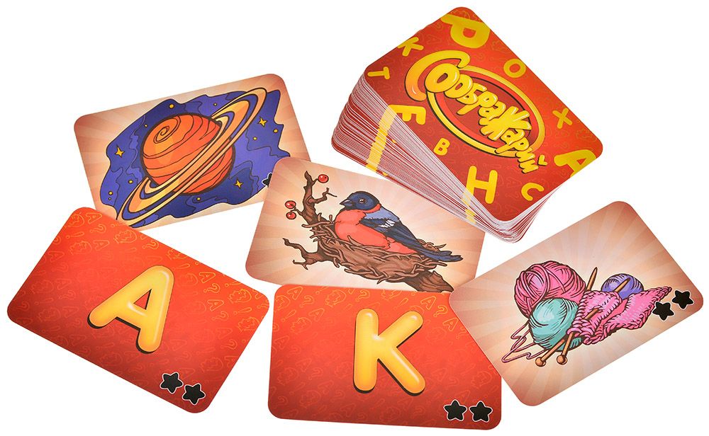 В коробке вы найдёте три основные колоды: 220 карт заданий, 54 карты картинок и 54 карты букв. Задания задают тему или категорию, в рамках которой нужно придумать слово, а буквенные карты указывают букву, с которой оно должно начинаться. Картинки добавляют более творческий режим: вместо готовой буквы игроки сами интерпретируют изображение и подбирают слово по ассоциации, что особенно нравится детям и визуалам.