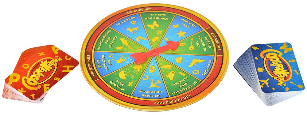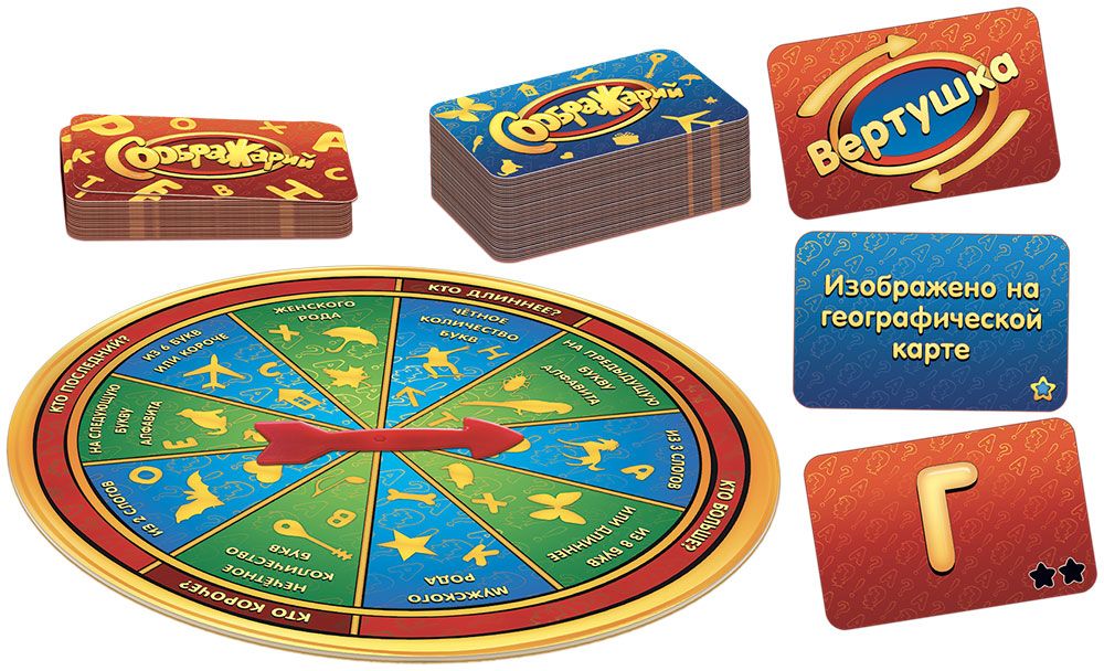 Карты «Вертушка» + физическая вертушка: отвечают за формат раунда и дополнительные условия (например, количество слов или тип ответа)