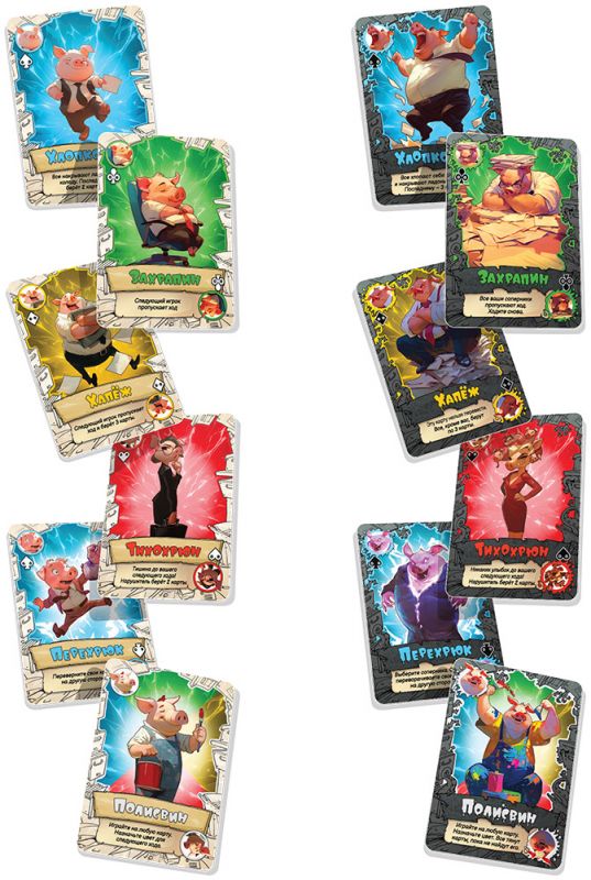 Специальные карты (например, «Перехрюк», «Полисвин», «Тихохрюн» и др.) добавляют особые условия: переворот рук, смену цвета, ограничения на разговоры за столом и дополнительные штрафы за ошибки.