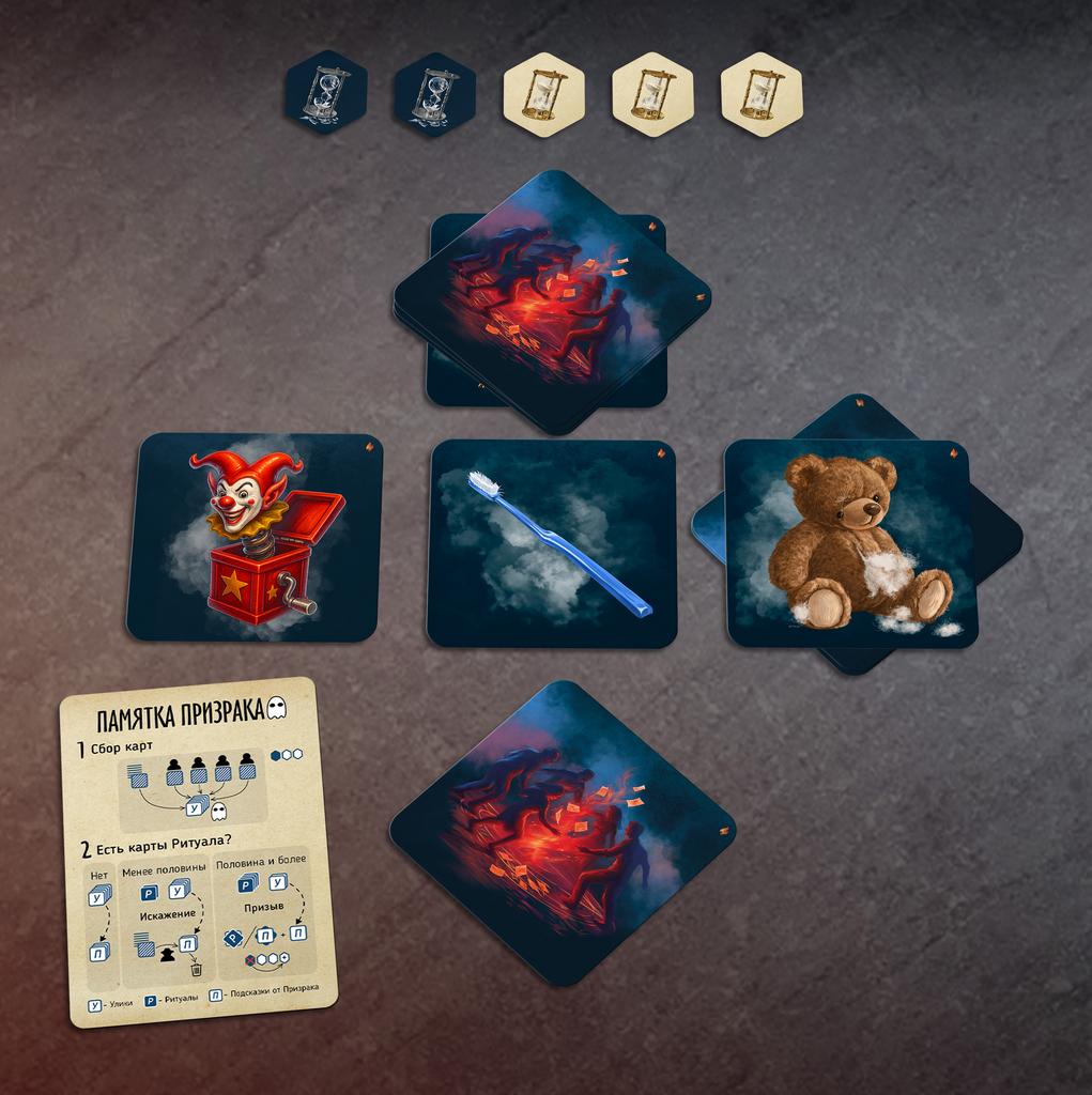 Один из игроков становится Призраком, остальные – Детективами, а в продвинутых режимах среди них могут скрываться Убийца и его Сообщник. Призрак единственный, кто знает истинный мотив, место и способ преступления, но не может произнести ни слова, поэтому общается с живыми через ассоциации на картах улик. Детективы пытаются по этим намёкам выделить три верные карты‑улики из множества похожих вариантов и собрать целостную версию произошедшего.