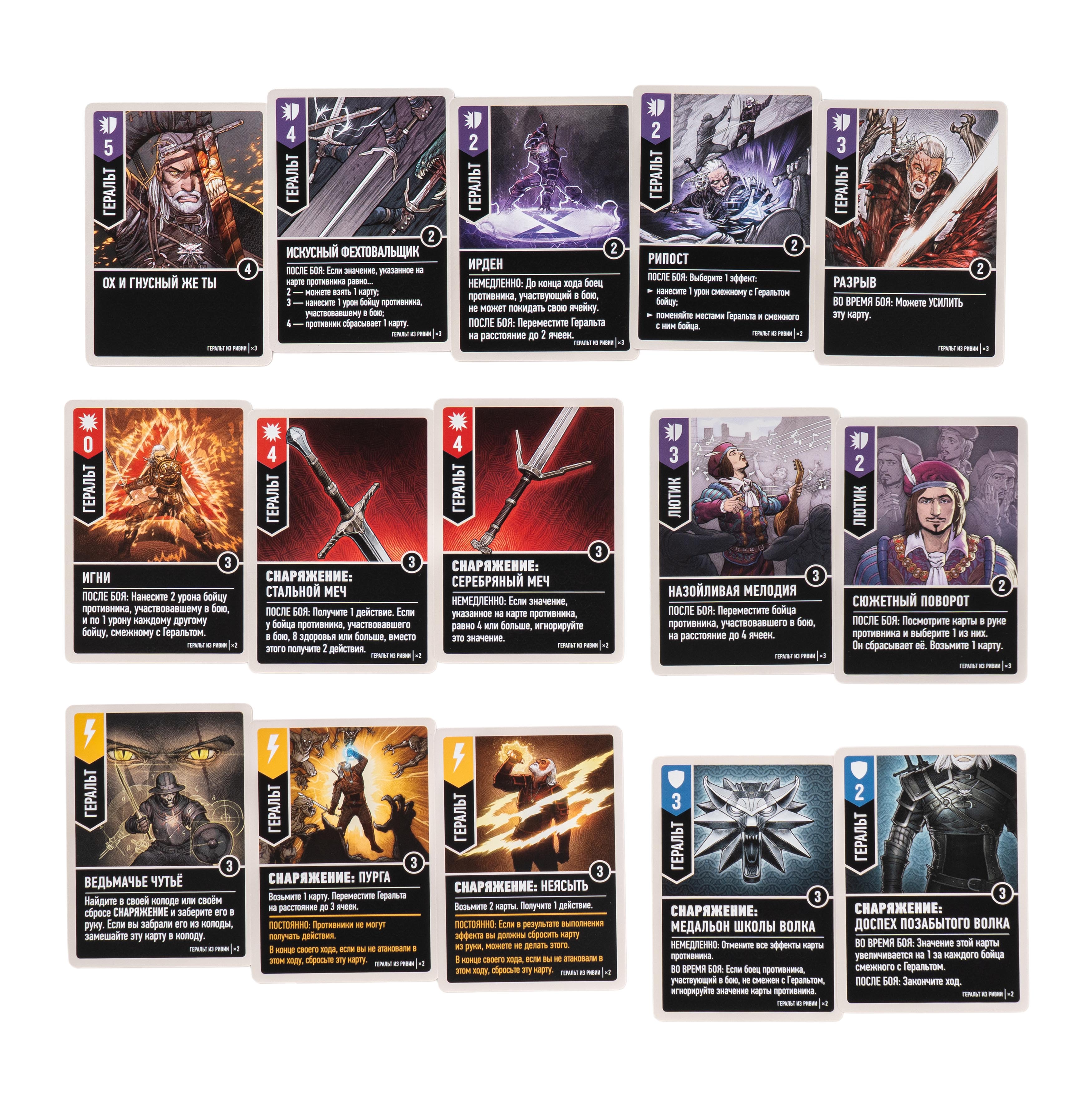 Геральт из Ривии — мастер адаптации. Перед боем выберите его снаряжение: доспехи, меч и эликсир, определяющие тактику. Его верный союзник Лютик помогает разгадывать планы врага. Колода Геральта — это фехтовальное искусство, знаки и ведьмачье чутьё в чистом виде.