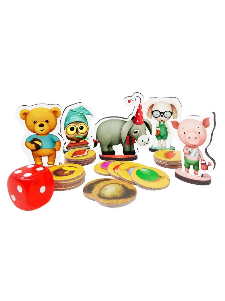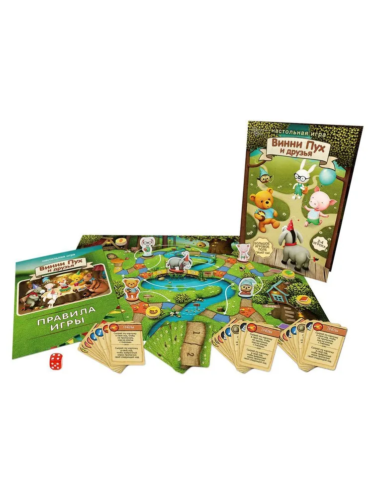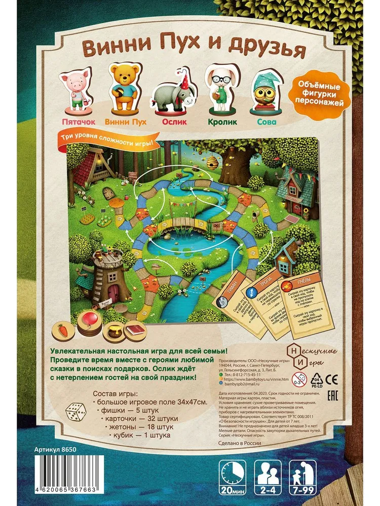 В комплекте идет большое красочное игровое поле, жетоны «подарки», карточки действий для усложнения игры и милые деревянные фигурки персонажей (Пятачок. Винни Пух, Ослик, Кролик, Сова)