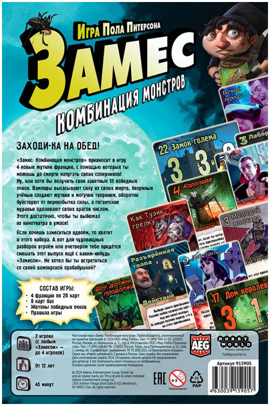 "Замес: Комбинация монстров" привносит в игру 4 новые жуткие фракции, с помощью которых вы можете до смерти напугать своих соперников! Ну, или хотя бы получить свои заветные 15 победных очков. Вампиры высасывают силу из своих жертв, безумные учёные создают жуткие и могучие творения, оборотни буйствуют от переизбытка силы, а гигантские муравьи одолевают своих врагов числом. Этого достаточно, чтобы вы выбежали из кинотеатра в ужасе!
