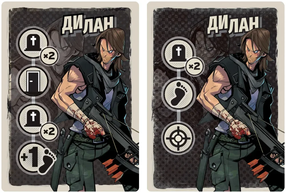 Дилан представлен отдельным набором компонентов: планшетом героя, фигуркой (или жетоном, в зависимости от тиража), собственным набором жетонов укусов и новым жетоном снаряжения особого типа. Его способности делают выживших более гибкими в борьбе против зомби: он способен точечно уничтожать опасных мутантов, удерживать ключевые участки укреплений и создавать для орд серьёзные узкие горлышки на подступах к убежищу. Для игроков‑зомби это означает, что простое давление числом уже не сработает — придётся продумывать обходные маршруты, комбинировать мутации и координировать атаки, чтобы прорвать оборону.